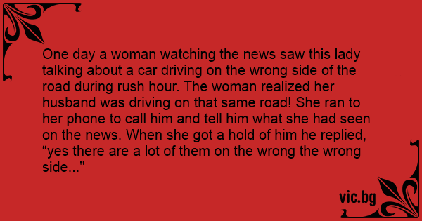 One day a woman watching the news saw this lady talking about a car driving on the wrong side of the road during rush hour. The woman realized her husband was driving on that same road! She ran to her phone to call him and tell him what she had seen on the news. When she got a hold of him he replied, “yes there are a lot of them on the wrong the wrong side..."