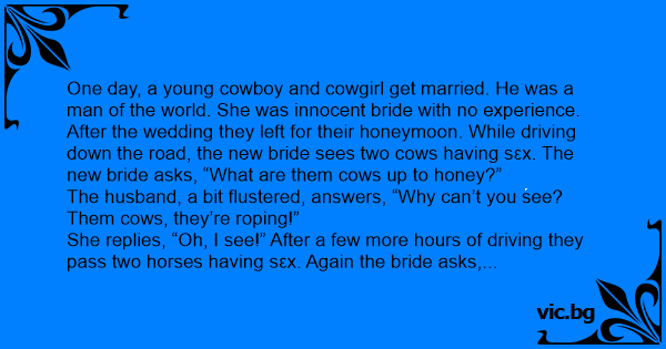 She replies, “Oh, I see!” After a few more hours of driving they pass two horses having sεx. Again the bride asks, “What are them horses doing honey?”
