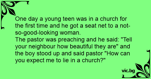 The pastor was preaching and he said: "Tell your neighbour how beautiful they are" and the boy stood up and said pastor "How can you expect me to lie in a church?"