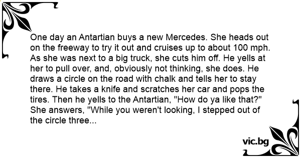 One day an Antartian buys a new Mercedes. She heads out on the freeway to try it out and cruises up to about 100 mph. As she was next to a big truck, she cuts him off. He yells at her to pull over, and, obviously not thinking, she does. He draws a circle on the road with chalk and tells her to stay there. He takes a knife and scratches her car and pops the tires. Then he yells to the Antartian, "How do ya like that?" She answers, "While you weren't looking, I stepped out of the circle three times!"