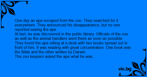 They found the ape sitting at a desk with two books spread out in front of him. It was reading with great concentration. One book was the Bible and the other written by Darwin.