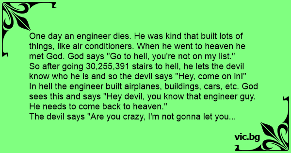 One day an engineer dies. He was kind that built lots of things, like air conditioners. When he went to heaven he met God. God says "Go to hеll, you're not on my list."