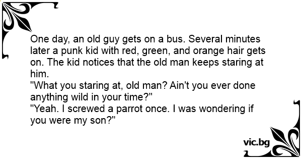 Um velho entra no ônibus e senta na frente de um punk com mechas verdes, vermelhas, azuis, amarelas. Ele fica olhando para o punk por muito tempo. O punk já irritado pergunta para o velho: — O que foi vovô? Nunca fez nada de diferente quando era jovem? — Fiz sim! Uma vez eu transei com uma arara....