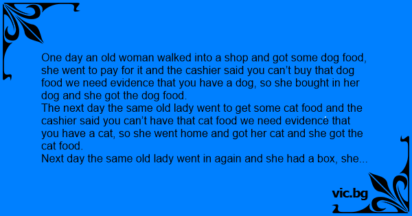 One day an old woman walked into a shop and got some dog food, she went to pay for it and the cashier said you can’t buy that dog food we need evidence that you have a dog, so she bought in her dog and she got the dog food.