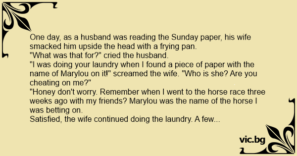 Satisfied, the wife continued doing the laundry. A few hours later, the wife smacked the husband with a frying pan again.