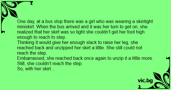 Девойка, с много тясна пола, се опитва да се качи в автобуса, но не се получава. Посяга отзад и разкопчава малко ципа на полата.
