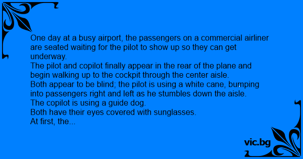 Two blind pilots get on a plane and walk right Through the main aisle, sporting white canes and dark shades. The passengers are mildly concerned but assume it’s all a joke. The plane starts taxiing...