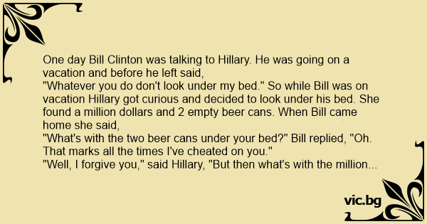 "Whatever you do don't look under my bed." So while Bill was on vacation Hillary got curious and decided to look under his bed. She found a million dollars and 2 empty вееr cans. When Bill came home she said,