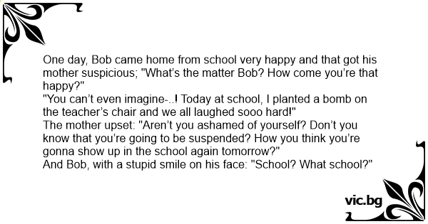 Bula intorcandu-se de la scoala: - Hei tata... - Cum a fost ora de chimie? - Bine, am facut niste explozibil... - Si maine ce o sa faceti la scoala? - Care scoala...?!?