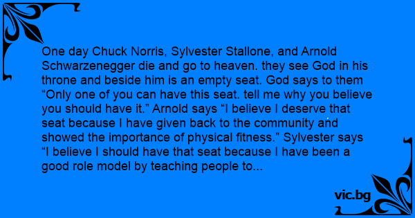 One day Chuck Norris, Sylvester Stallone, and Arnold Schwarzenegger die and go to heaven. they see God in his throne and beside him is an empty seat. God says to them “Only one of you can have this seat. tell me why you believe you should have it.” Arnold says “I believe I deserve that seat because I have given back to the community and showed the importance of physical fitness.” Sylvester says “I believe I should have that seat because I have been a good role model by teaching people to stand up for themselves.” Chuck Norris then goes over to God, looks at him in the eyes and says, “I believe you are sitting in my seat.”