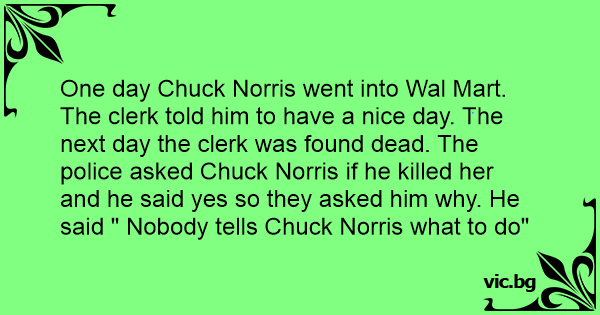 One day Chuck Norris went into Wal Mart. The clerk told him to have a nice day. The next day the clerk was found dead. The police asked Chuck Norris if he killed her and he said yes so they asked him why. He said " Nobody tells Chuck Norris what to do"