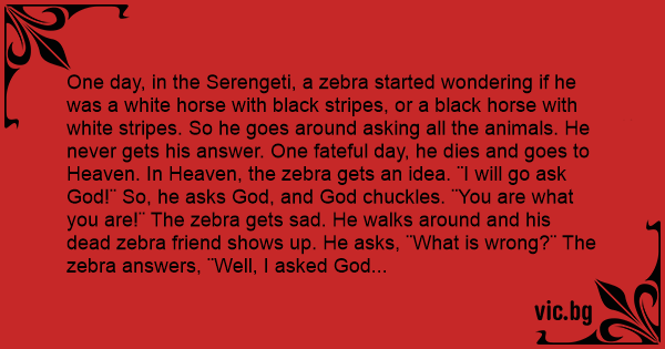 One day, in the Serengeti, a zebra started wondering if he was a white horse with black stripes, or a black horse with white stripes. So he goes around asking all the animals. He never gets his answer. One fateful day, he dies and goes to Heaven. In Heaven, the zebra gets an idea. ¨I will go ask God!¨ So, he asks God, and God chuckles. ¨You are what you are!¨ The zebra gets sad. He walks around and his dead zebra friend shows up. He asks, ¨What is wrong?¨ The zebra answers, ¨Well, I asked God if I was either a white horse with black stripes, or a black horse with white stripes. He just replied ´You are what you are!´¨ His friend says, ¨Oh! You are a white horse with black stripes! Why? Because he would have said ´You is what you is!´