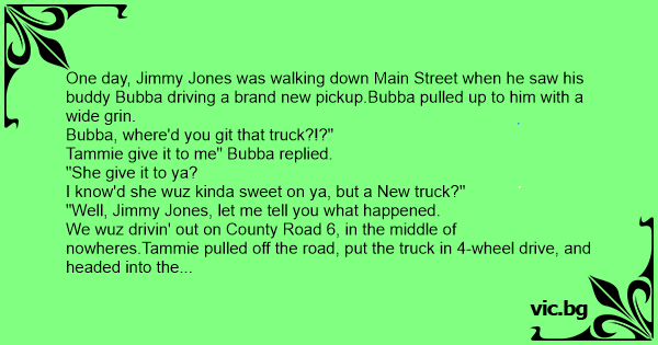One day, Jimmy Jones was walking down Main Street when he saw his buddy Bubba driving a brand new pickup.Bubba pulled up to him with a wide grin.