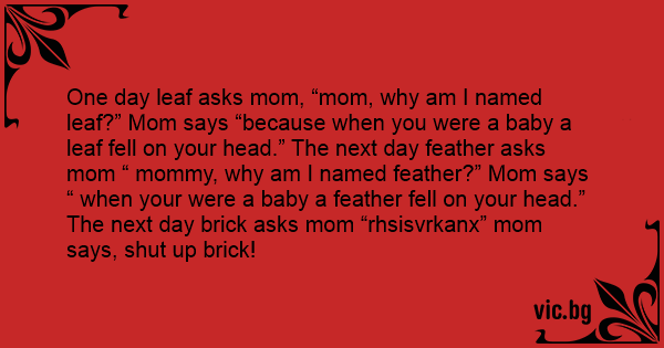 One day leaf asks mom, “mom, why am I named leaf?” Mom says “because when you were a baby a leaf fell on your head.” The next day feather asks mom “ mommy, why am I named feather?” Mom says “ when your were a baby a feather fell on your head.” The next day brick asks mom “rhsisvrkanx” mom says, shut up brick!