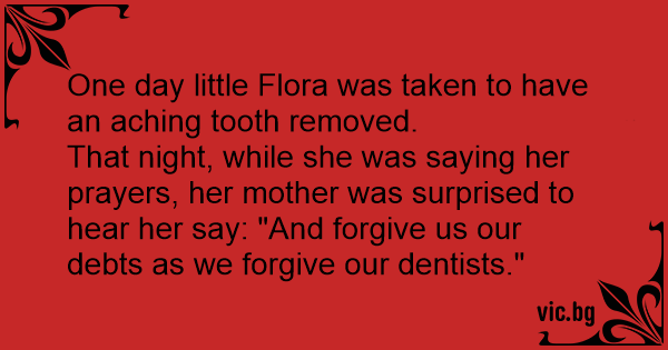 That night, while she was saying her prayers, her mother was surprised to hear her say: "And forgive us our debts as we forgive our dentists."