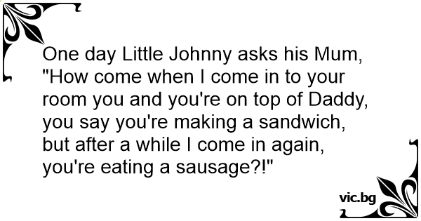 One day Little Johnny asks his Mum, "How come when I come in to your room you and you're on top of Daddy, you say you're making a sandwich, but after a while I come in again, you're eating a sausage?!"