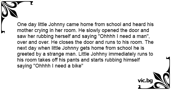 One day little Johnny came home from school and heard his mother crying in her room. He slowly opened the door and saw her rubbing herself and saying "Ohhhh I need a man", over and over. He closes the door and runs to his room. The next day when little Johnny gets home from school he is greeted by a strange man. Little Johhny immediately runs to his room takes off his pants and starts rubbing himself saying "Ohhhh I need a bike"