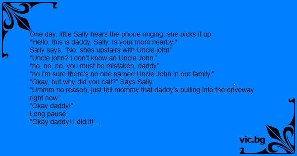 Rrriiiiinnnnggg, rrriiiinnnngg, **’Hello?’** **’Hi honey.** **This is Daddy.** **Is Mommy near the phone?’** **’No, Daddy.** **She’s upstairs in the bedroom with Uncle Paul.’** **After a brief...