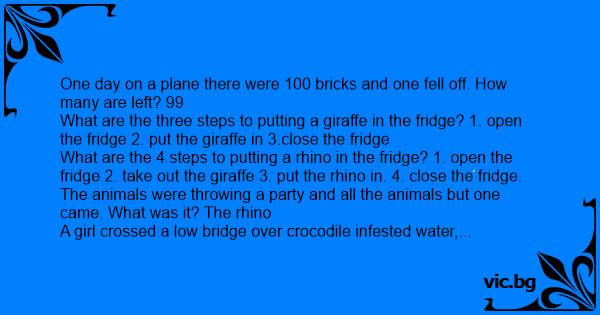 Time for a story: There are 500 bricks on a plane, one falls off. How many are left? What are the 3 steps to putting an elephant in a refrigerator? Open fridge, put in elephant, close fridge. What...