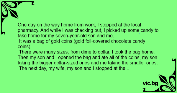 One day on the way home from work, I stopped at the local pharmacy. And while I was checking out, I picked up some candy to take home for my seven-year-old son and me.