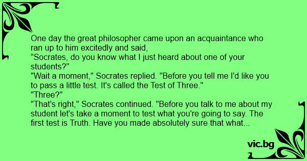 "Wait a moment," Socrates replied. "Before you tell me I'd like you to pass a little test. It's called the Test of Three."