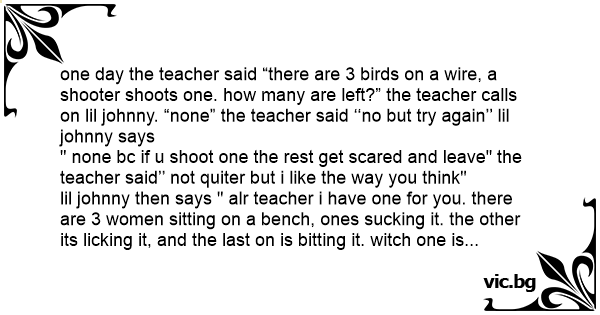 lil johnny then says " alr teacher i have one for you. there are 3 women sitting on a bench, ones suскing it. the other its licking it, and the last on is bitting it. witch one is married?"