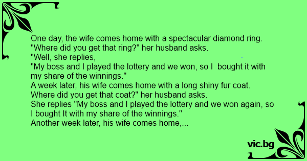 One day, the wife comes home with a spectacular diamond ring.