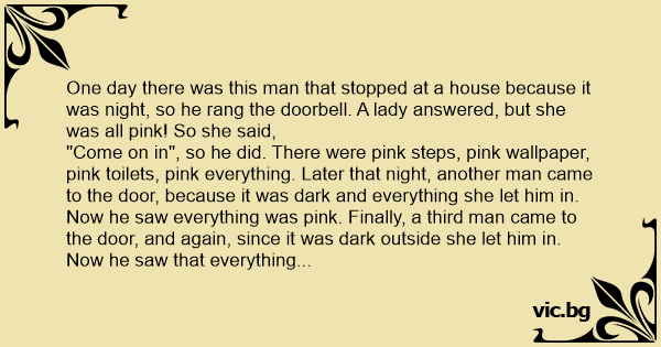 One day there was this man that stopped at a house because it was night, so he rang the doorbell. A lady answered, but she was all pink! So she said,