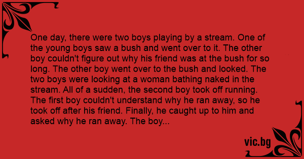 One day, there were two boys playing by a stream. One of the young boys saw a bush and went over to it. The other boy couldn't figure out why his friend was at the bush for so long. The other boy went over to the bush and looked. The two boys were looking at a woman bathing nакеd in the stream. All of a sudden, the second boy took off running. The first boy couldn't understand why he ran away, so he took off after his friend. Finally, he caught up to him and asked why he ran away. The boy said to his friend, "My mom told me if I ever saw a nакеd lady, I would turn to stone, and I felt something getting hard, so I ran."