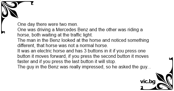 The guy in the Benz was really impressed, so he asked the guy riding the horse if he wanted to trade the horse for the Benz, so he agreed.