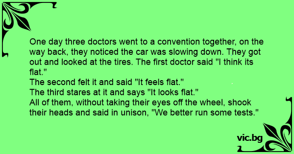 One day three doctors went to a convention together, on the way back, they noticed the car was slowing down. They got out and looked at the tires. The first doctor said "I think its flat."