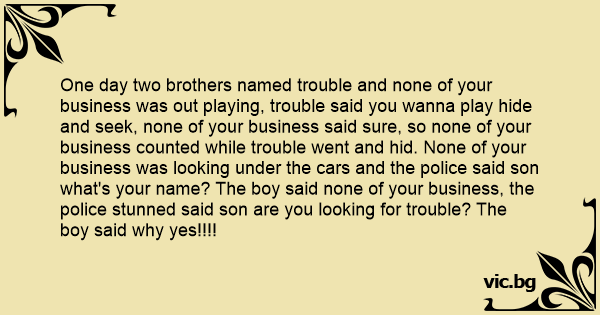 One day two brothers named trouble and none of your business was out playing, trouble said you wanna play hide and seek, none of your business said sure, so none of your business counted while trouble went and hid. None of your business was looking under the cars and the police said son what's your name? The boy said none of your business, the police stunned said son are you looking for trouble? The boy said why yes!!!!