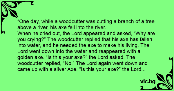 When he cried out, the Lord appeared and asked, “Why are you crying?” The woodcutter replied that his axe has fallen into water, and he needed the axe to make his living. The Lord went down into the water and reappeared with a golden axe. “Is this your axe?” the Lord asked. The woodcutter replied, “No.” The Lord again went down and came up with a silver Axe. “Is this your axe?” the Lord asked. Again, the woodcutter replied, “No.” The Lord went down again and came up with an iron Axe. “Is this your axe?” the Lord asked. The woodcutter replied, “Yes.”
