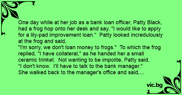 "I'm sorry, we don't loan money to frogs." To which the frog replied, "I have collateral," as he handed her a small ceramic trinket. Not wanting to be impolite, Patty said,