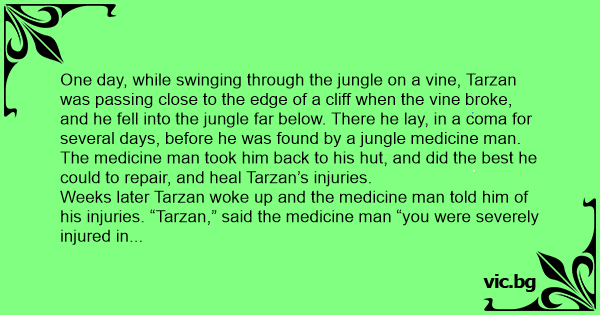 Weeks later Tarzan woke up and the medicine man told him of his injuries. “Tarzan,” said the medicine man “you were severely injured in the fall, and I had to use what I had available to heal you. You lost your arms, so I replaced them with those from a gorilla. You lost your legs, which I replaced with those from a kangaroo. But I fear your worst injury was the loss of your реnis. But don’t worry, I was able to attach an elephant’s trunk which should serve you well.” He then told Tarzan to return in one month to up-date his progress.