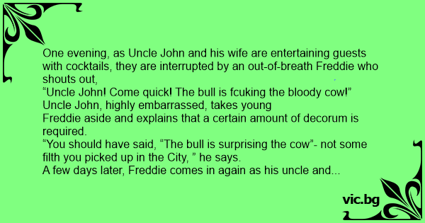 The adults share a knowing grin. Uncle John says, “Thank you Freddie, but surely you meant to say the соw, not *cows*. A bull cannot “surprise” more than one соw at a time you know. . .”.
