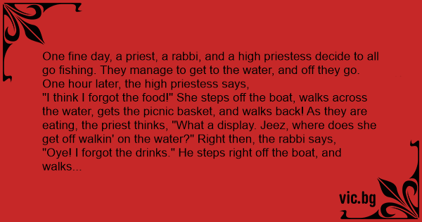 "I think I forgot the food!" She steps off the boat, walks across the water, gets the picnic basket, and walks back! As they are eating, the priest thinks, "What a display. Jeez, where does she get off walkin' on the water?" Right then, the rabbi says,