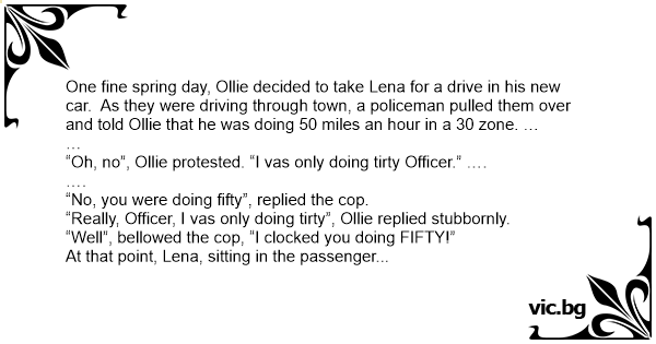 One fine spring day, Ollie decided to take Lena for a drive in his new car. As they were driving through town, a policeman pulled them over and told Ollie that he was doing 50 miles an hour in a 30 zone. …