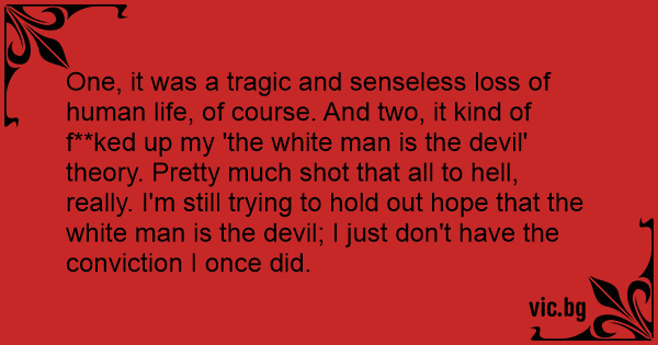 One, it was a tragic and senseless loss of human life, of course. And two, it kind of f**ked up my 'the white man is the devil' theory. Pretty much shot that all to hеll, really. I'm still trying to hold out hope that the white man is the devil; I just don't have the conviction I once did.