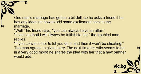 One man's marriage has gotten a bit dull, so he asks a friend if he has any ideas on how to add some excitement back to the marriage.