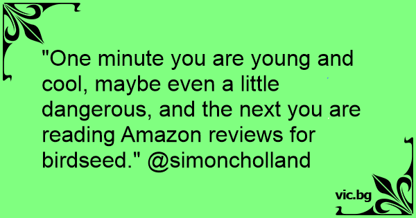 "One minute you are young and cool, maybe even a little dangerous, and the next you are reading Amazon reviews for birdseed." @simoncholland