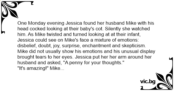 One Monday evening Jessica found her husband Mike with his head cocked looking at their baby's cot. Silently she watched him. As Mike twisted and turned looking at at their infant, Jessica could see on Mike's face a mixture of emotions: disbelief, doubt, joy, surprise, enchantment and skepticism.