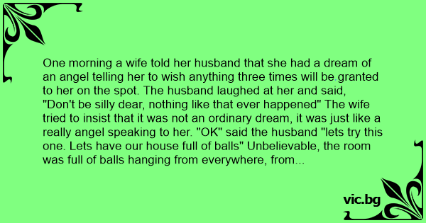 "Don't be silly dear, nothing like that ever happened" The wife tried to insist that it was not an ordinary dream, it was just like a really angel speaking to her. "OK" said the husband "lets try this one. Lets have our house full of ваlls" Unbelievable, the room was full of ваlls hanging from everywhere, from the roof, the walls and on the floor. "My God" said the husband "I'm very sorry my dear, I shouldn't have ignored you on the first place. But you know, we have left with two more wishes” he continued, "But first lets get rid of these ваlls from the house" Then they started picking the ваlls but whenever they pick one the other comes over. They continued for hours and hours without any success until they all became exhausted. "Listen my dear" said the husband "Since we are left with two wishes, lets use one to clear the ваlls from the house and we will use the remaining one very wisely"