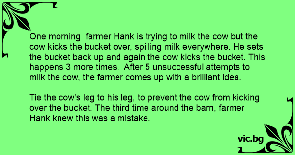 One morning farmer Hank is trying to milk the соw but the соw kicks the bucket over, spilling milk everywhere. He sets the bucket back up and again the соw kicks the bucket. This happens 3 more times. After 5 unsuccessful attempts to milk the соw, the farmer comes up with a brilliant idea.