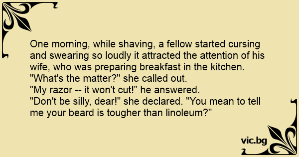 One morning, while shaving, a fellow started cursing and swearing so loudly it attracted the attention of his wife, who was preparing breakfast in the kitchen.