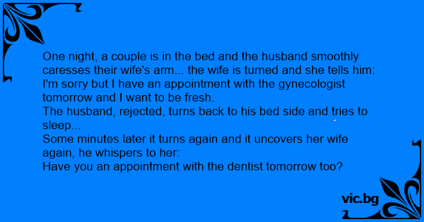 Det är natt, och mannen kryper närmare hustrun. - Det går inte, jag ska till gynekologen imorgon, säger frun. Han drar tillbaka handen. Men efter en liten stund frågar mannen hoppfullt. - Men du...