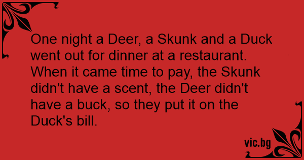 One night a Deer, a Skunk and a Duck went out for dinner at a restaurant. When it came time to pay, the Skunk didn't have a scent, the Deer didn't have a buck, so they put it on the Duck's bill.
