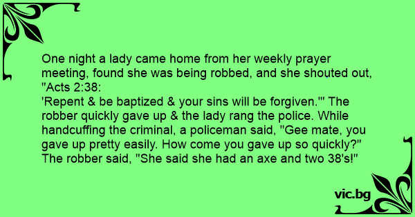 'Repent & be baptized & your sins will be forgiven.'" The robber quickly gave up & the lady rang the police. While handcuffing the criminal, a policeman said, "Gee mate, you gave up pretty easily. How come you gave up so quickly?" The robber said, "She said she had an axe and two 38's!"