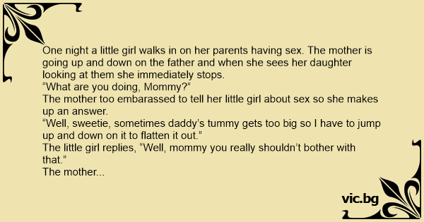 En dag när den lille gossen öppnade sovrumsdörren låg mamma och drog fram och tillbaks på pappas snopp. Gossen frågade vad de gjorde, varpå mamman generat harklade sig och sa: - Det är så att...