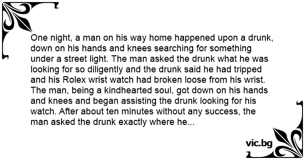 One night, a man on his way home happened upon a drunк, down on his hands and knees searching for something under a street light. The man asked the drunк what he was looking for so diligently and the drunк said he had tripped and his Rolex wrist watch had broken loose from his wrist. The man, being a kindhearted soul, got down on his hands and knees and began assisting the drunк looking for his watch. After about ten minutes without any success, the man asked the drunк exactly where he tripped. "About a half a block up the street," the drunк said. "Why, pray tell," the man asked the drunк, "are you looking for your watch here if you lost it a half a block up the street?" The drunк replied, "The light is a lot better here."